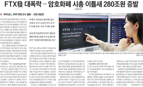[ 2022년 11월 11일 A2면 ] FTX發 대폭락…암호화폐 시총 이틀새 280조원 증발